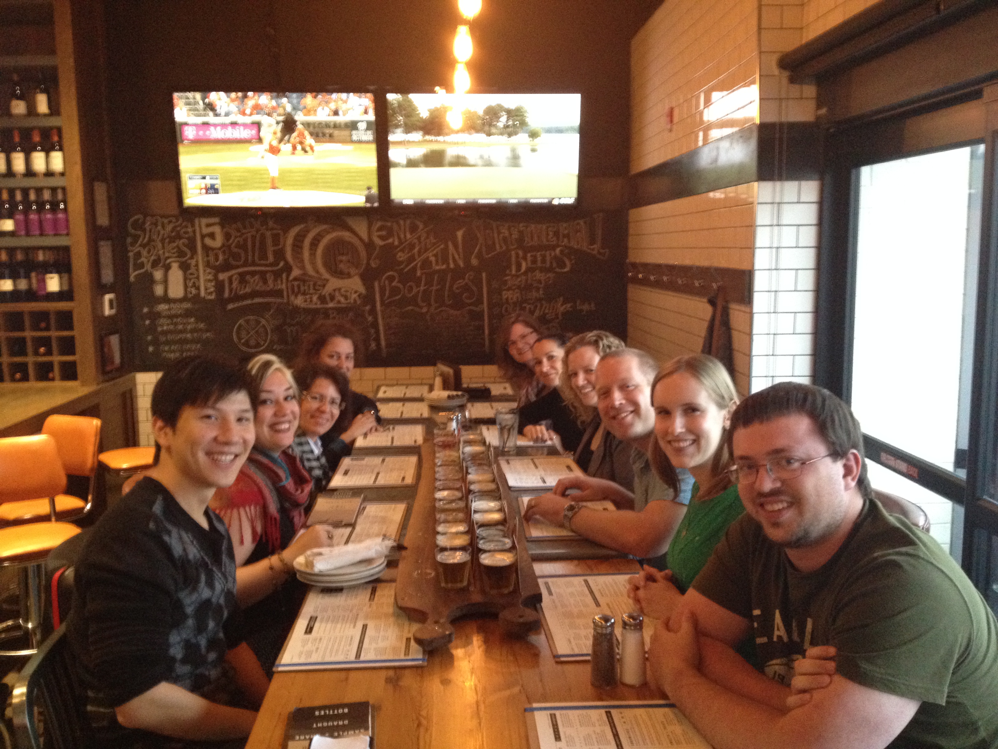 Celebrating Teddy and Tanaz's MSc graduation at BeerTown, Left from Front: Teddy, Tanaz, Ruth, Maria, Right: Matt, Emily, Paul, Stephanie, Suzy, Nancy